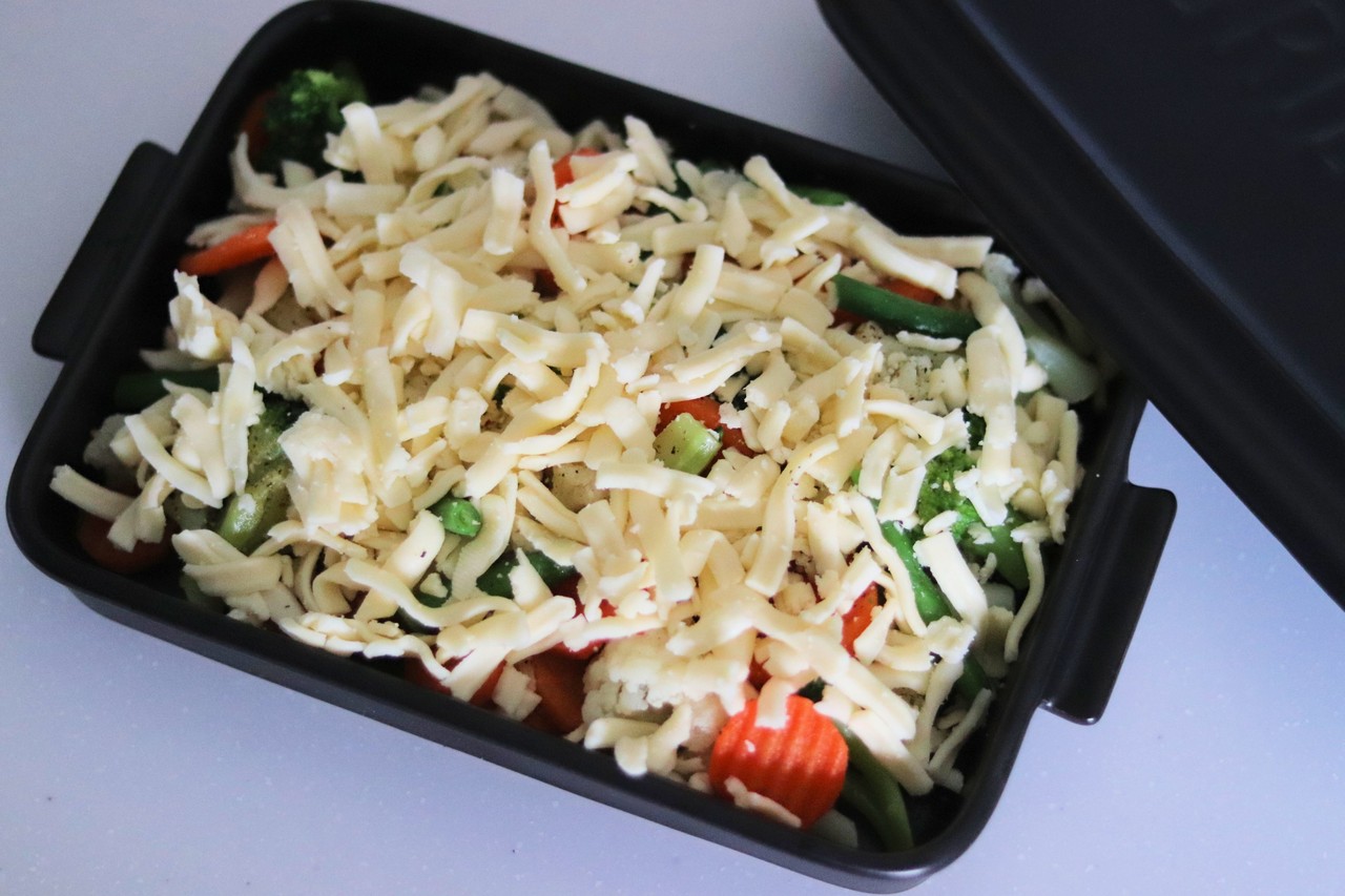 冷凍野菜ミックスの上に、塩コショウと