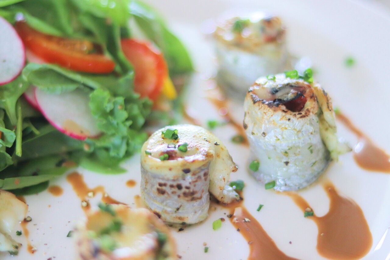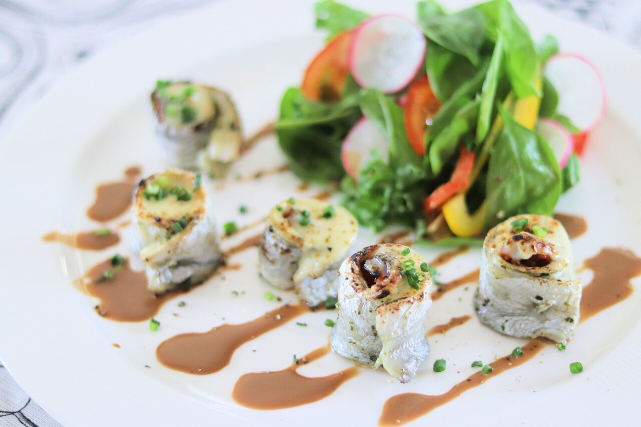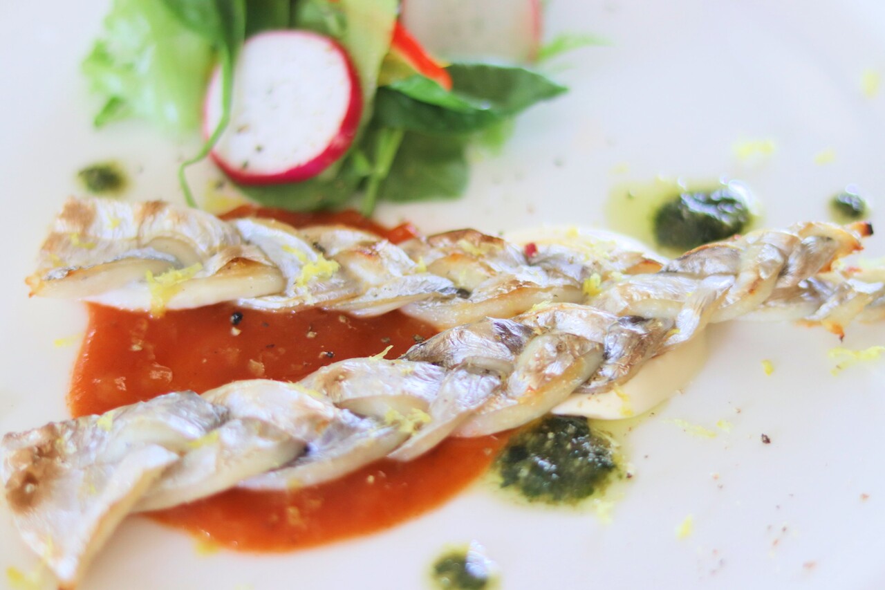 3枚におろした太刀魚に、バジルソースと