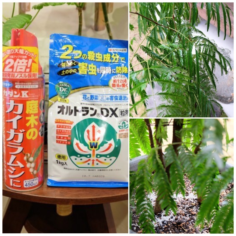 庭に出してスプレーを葉に散布し、オルイトランDXという粒剤を根元に。